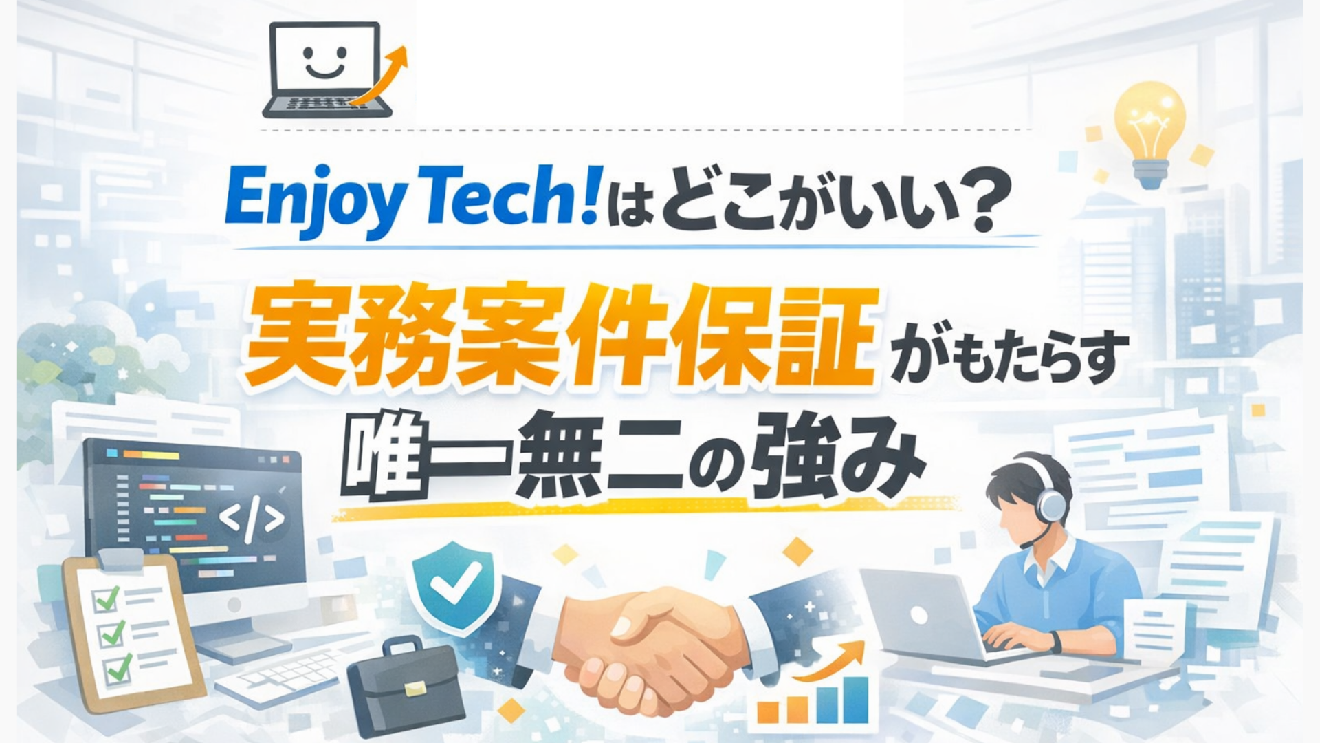 Enjoy Tech!の最大の強みは、受講中に実際の制作案件へ参画できる「実務案件保証」です。しかし、どのような難易度の案件なのか、どの程度のサポートを受けながら進められるのかは、人によって不安が残る部分でしょう。